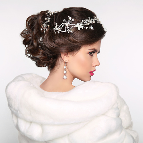 Für die perfekte Hochzeitsfrisur: voluminöse Haarteile, glitzernde Diademe und Kronen, funkelnde Haarbänder, Blumenkränze oder Hüte.