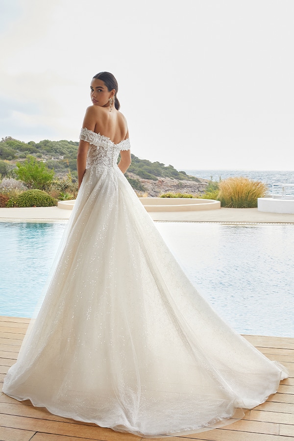 Eine Frau mit elegantem Gesichtsausdruck trägt ein weißes, besticktes Brautkleid